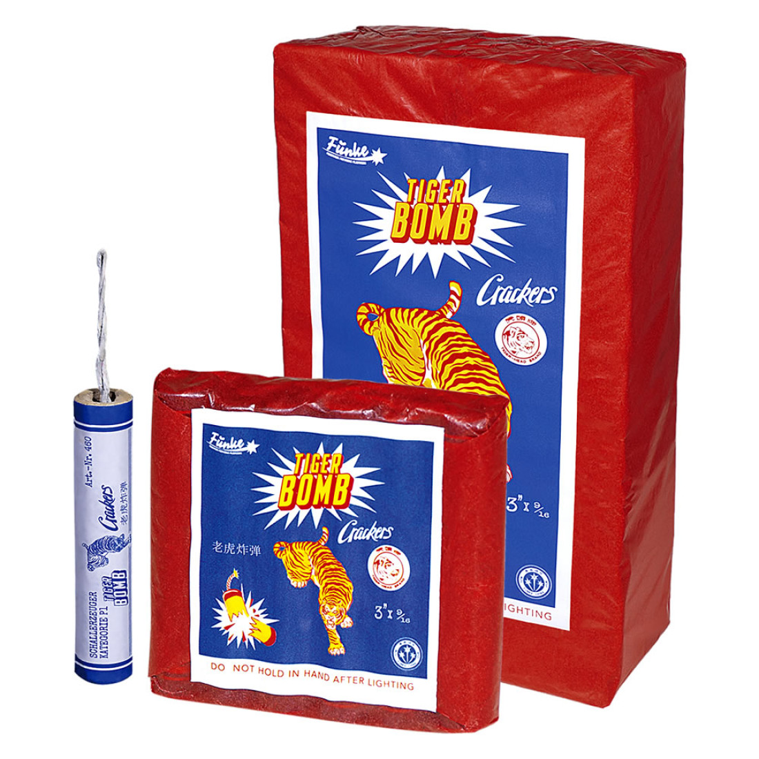 Sonderedition „Tiger Bomb“ unserer Schallerzeuger in traditioneller chinesischer Bauart, in der Größe 460 ( 3“ x 9/16“). 6 Stück pro Packung, 40 Packungen pro Schinken.