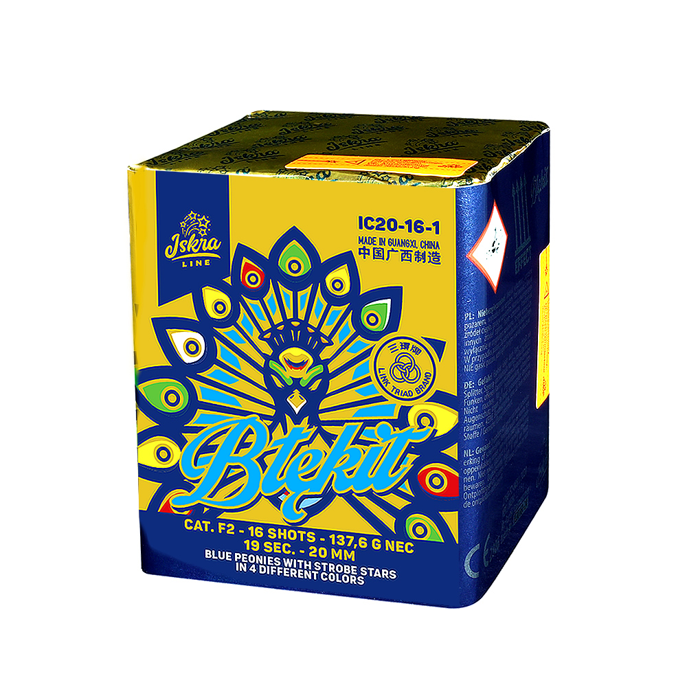 16 Schuss blaue Leuchtspuraufstiege zu blauen Sternbuketts mit Blinkern in Gold, Grün, Rot und Weiß.