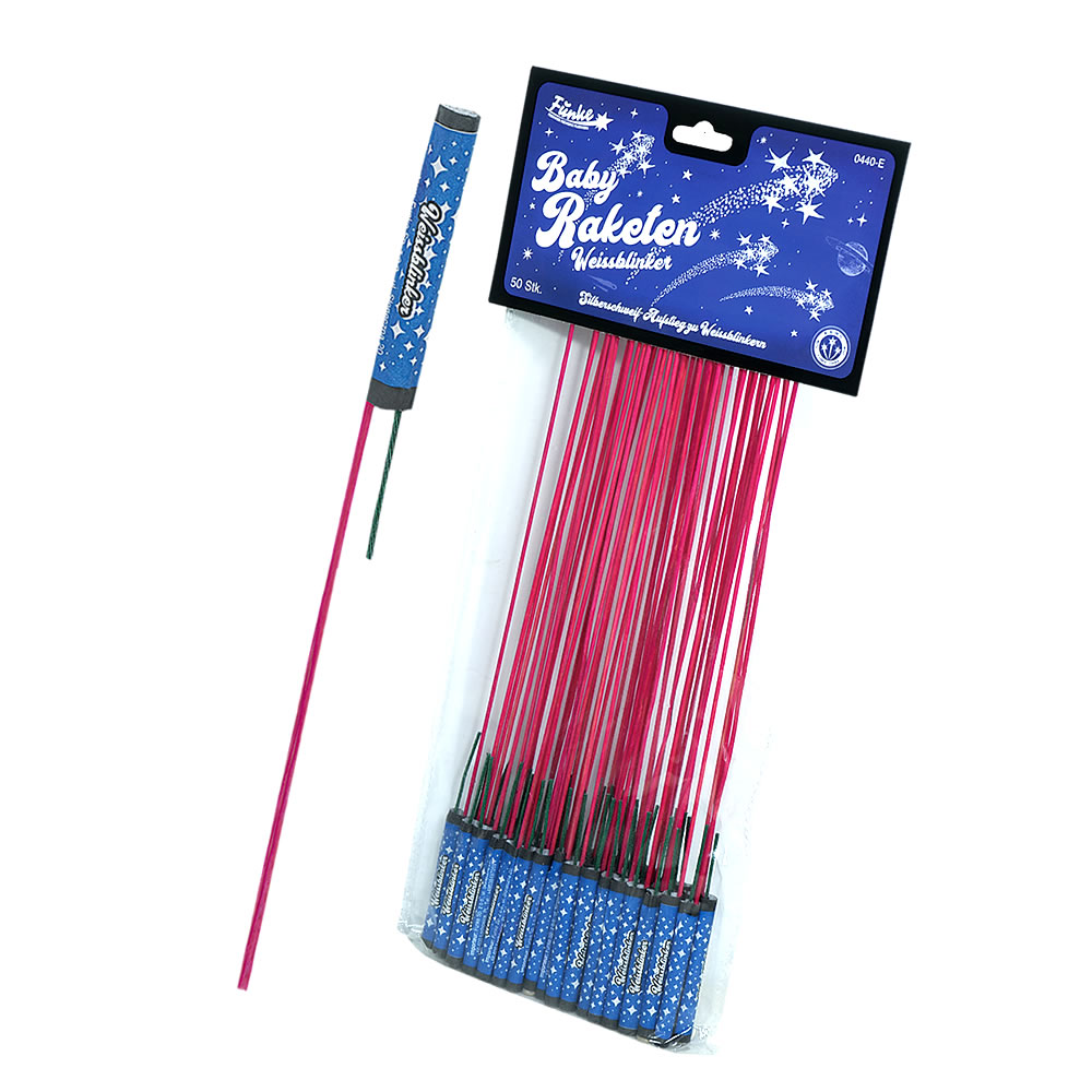 50 Baby-Raketen mit Silberschweif-Aufstieg zu weißen Blinksternen.
