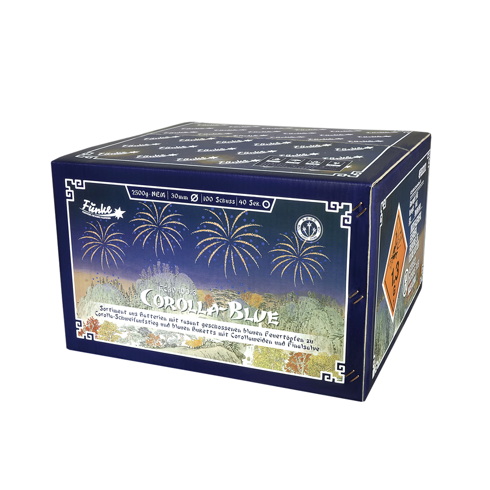 Blauer Feuertopf zu silbercracker-Schweifaufstieg zu laut platzenden Silbercrackern mit blutroten Dahliensternen